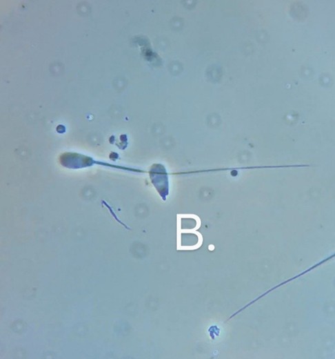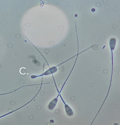 Vacuoles can be anything from a single subtle crater to multiple large ‘bite like’ craters across the sperm head. Small, subtle ones are only detectable under a phase contrast or DIC microscope. They occur during the final stage of spermatogenesis and can be a result of stress events like acidosis or heat stress. Bulls with high percentages of these abnormalities (>20%) are suggested to have poor pregnancy rates, but the jury is still out on how it impacts fertility. Sperm cannot bind to the ovum (large vacuoles) but if they do (small craters) the disruption to the DNA may cause early embryonic death.